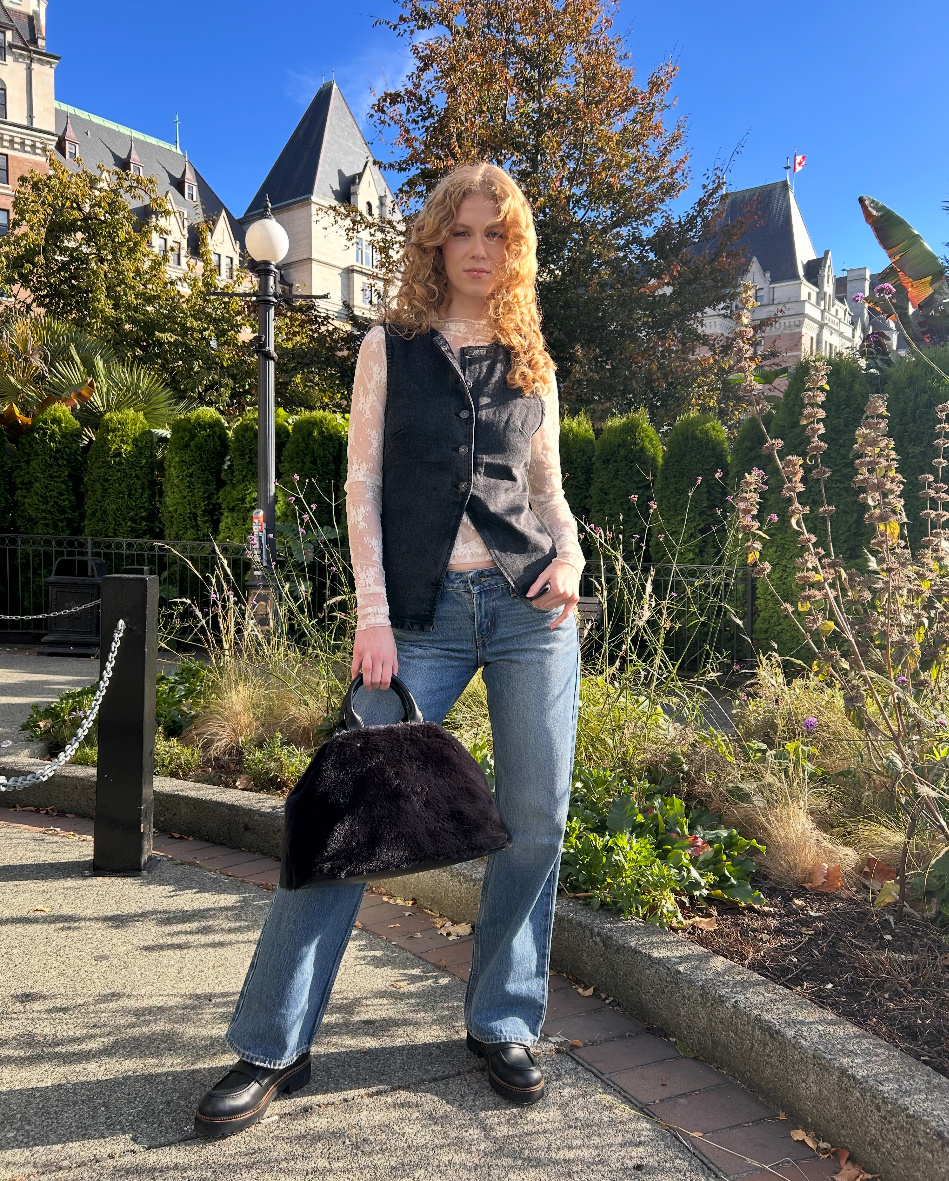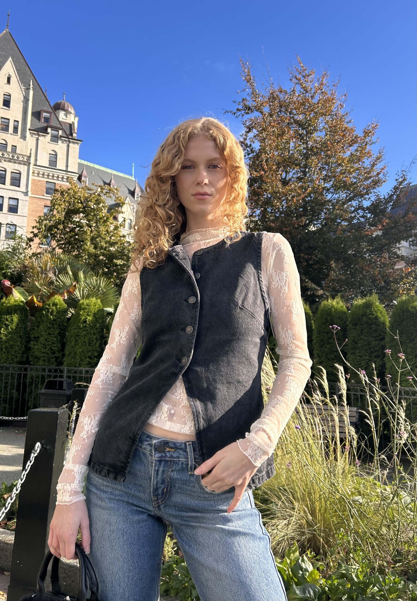 Features: Washed denim fabrication, crew neckline, flattering darting, button-front closure, flared pointed hem