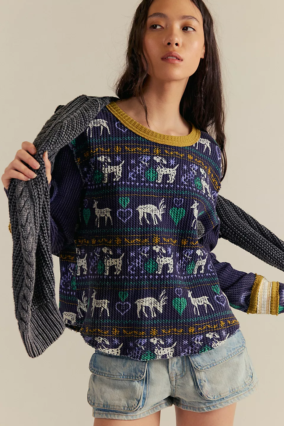 Features: Waffle-knit fabrication, scoop-neckline, drop-shoulder sleeves with cuffs, contrast trim, defined seam detailing, printed detail all over
