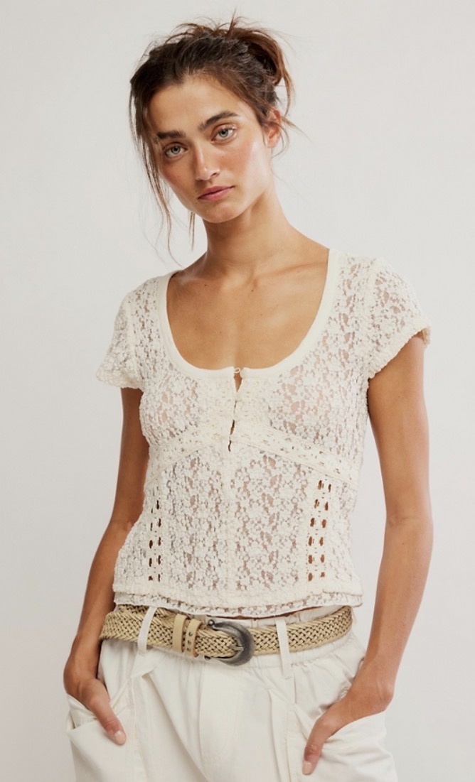 Free PeopleFree People Claro Short Sleeve Tee C$118.00 Make a choice COLOR: WHISPER WHITE, SIZE: S COLOR: WHISPER WHITE, SIZE: M COLOR: WHISPER WHITE, SIZE: XS COLOR: WHISPER WHITE, SIZE: LColor: *Whisper WhiteSize: *SMXSLAdd to cartLogin for wishlistBuy NowDescriptionShareDelicately designed, this ethereal tee features a sheer lace fabrication and a fitted, flattering design for a romantic touch. Facebook Whatsapp