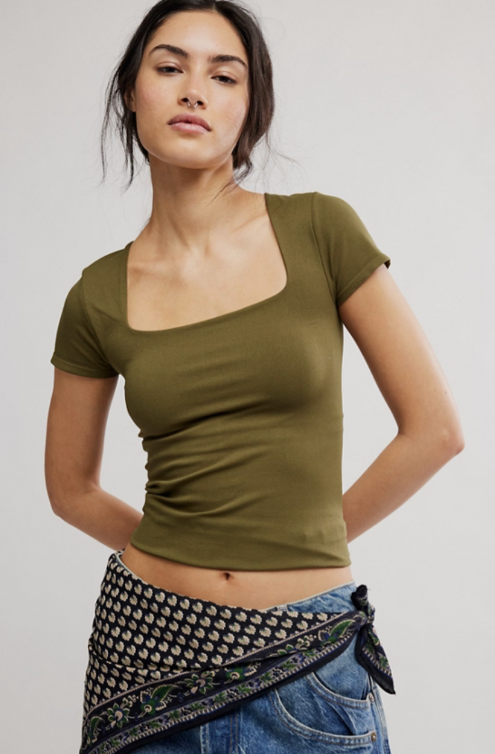 Features: Buttery soft fabrication with a stretchy feel, seamless design, square neckline, cap-inspired sleeves, lining at bust