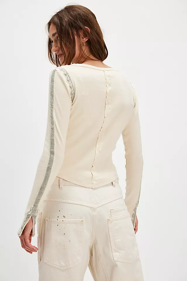 Features: Ribbed cotton fabrication, boat-neckline, long-sleeves with split hems, contrast lace trim