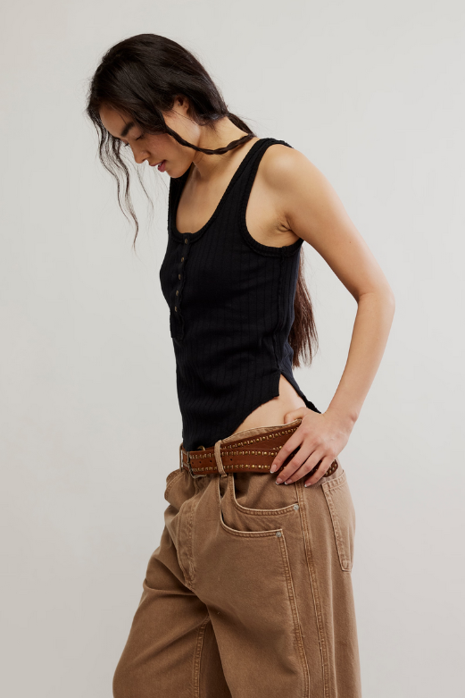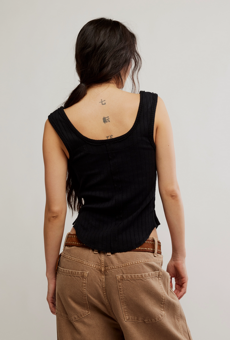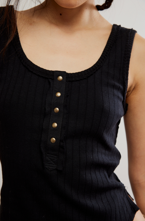 Features: Recycled/organic cotton blend, scoop neckline, henley snap detail, wide ribbed texture, rounded hem, exposed seams