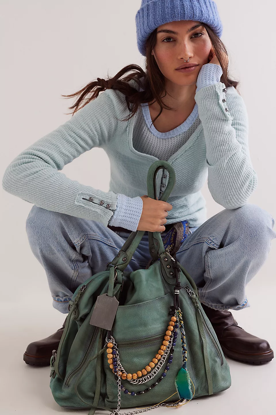 100% Leather- Features: Slouchy style, spacious interior, worn leather fabrication, exterior zipper compartments, exterior and interior pockets, buckle details, two top handles, detachable and adjustable shoulder strap, zipper closure, branded tag