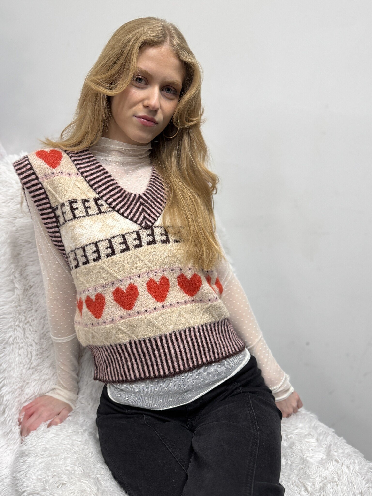 FrnchFrnch Rhubarbe Vest C$168.00 Make a choice COLOR: BEIGE, SIZE: S COLOR: BEIGE, SIZE: M COLOR: BEIGE, SIZE: LColor: *BeigeSize: *SMLAdd to cartLogin for wishlistBuy NowDescriptionShareSleeveless jumper softly knitted with V neckline. It comes with exclusive FRNCH pattern with their signature 'F' , contrast stripe trim and hearts. Facebook Whatsapp