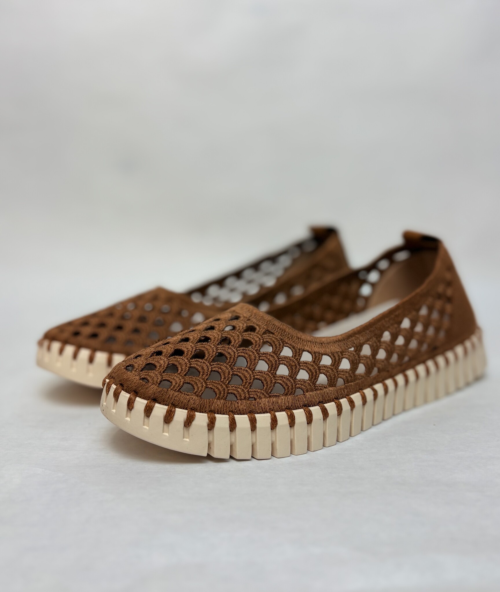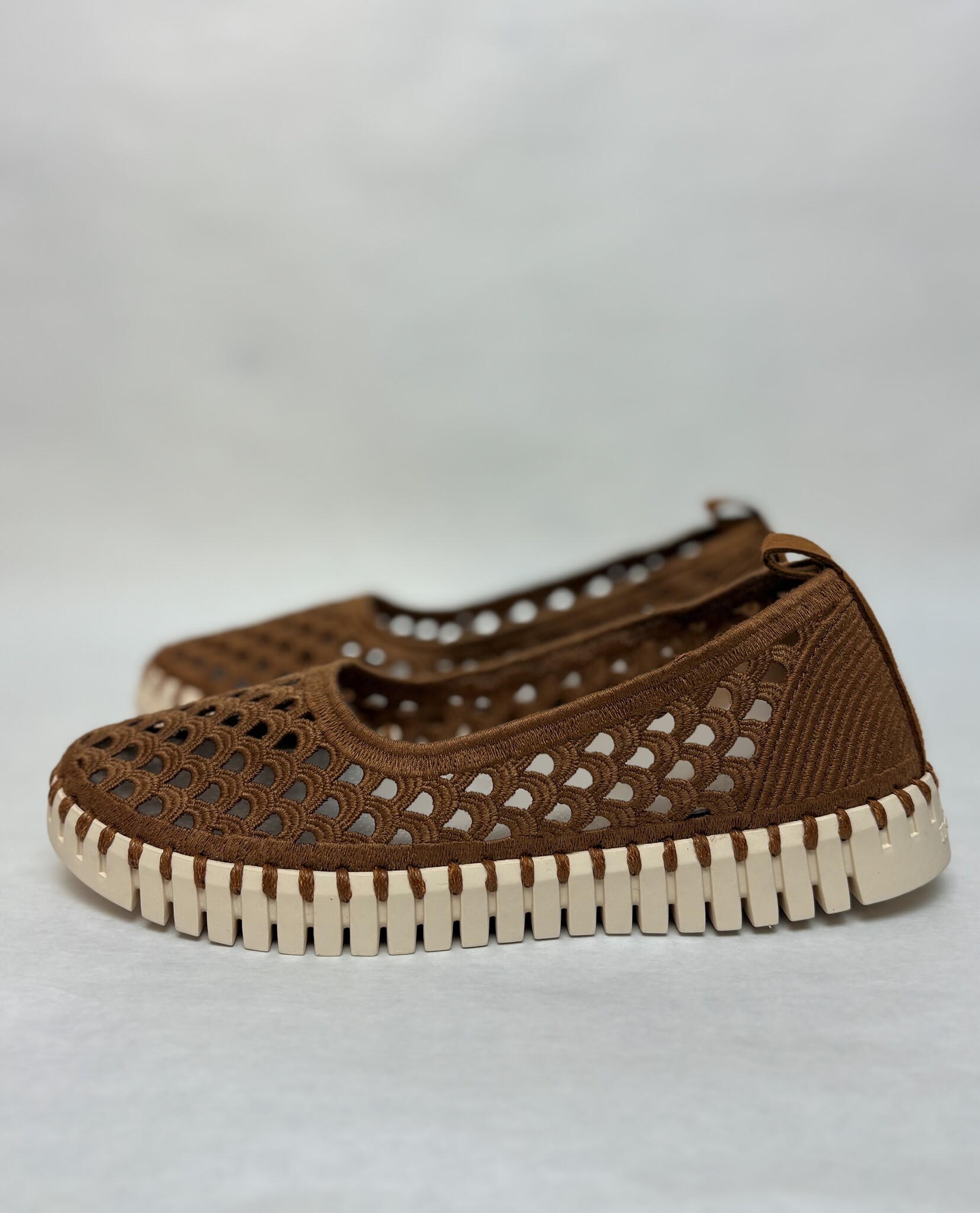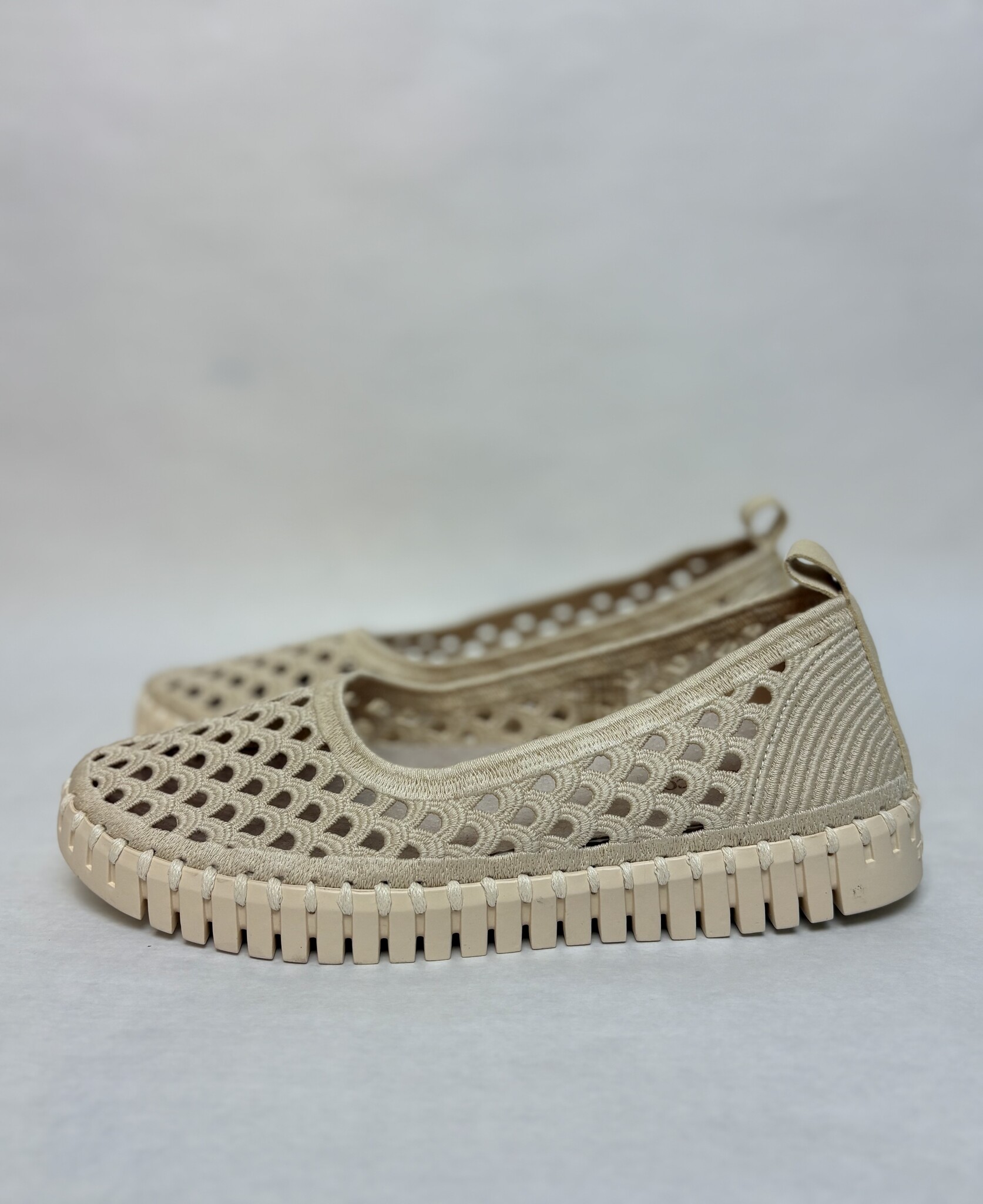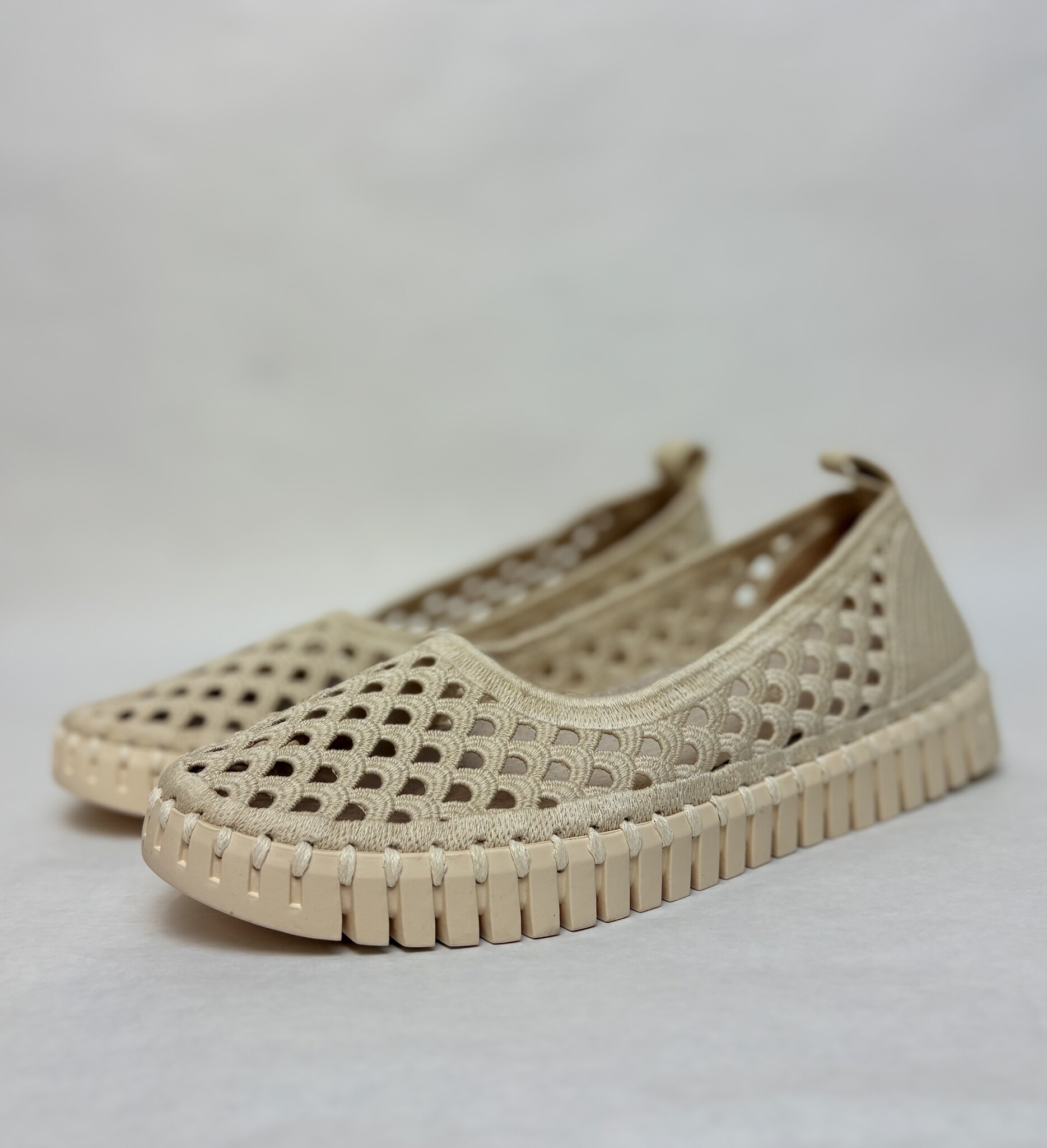- Soft material upper with breathable perforations