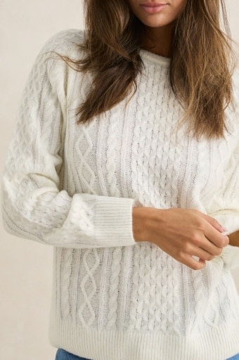 Product description47% Acrylic 30% Nylon 15% Wool 8% MohairCable KnitCrew Neck StyleOversized And Relaxed FitRib Knit CollarRib Knit Cuffs And Bottom Opening