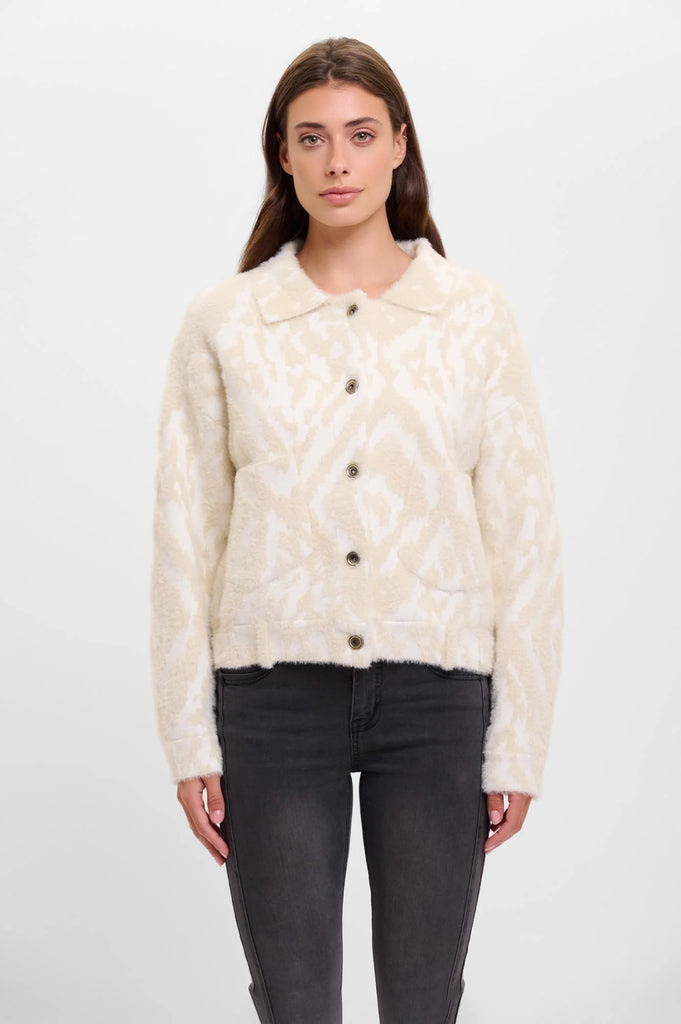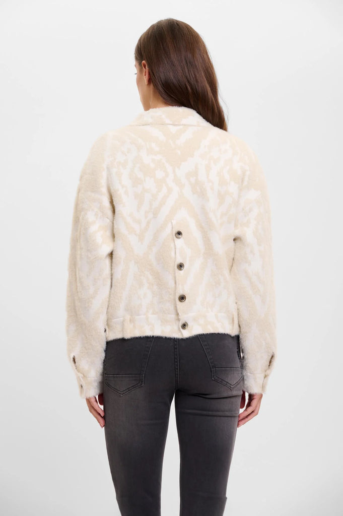 This short jacket features a contemporary boxy silhouette, a flat collar, a button closure, two open front pockets, a button closure on each cuff and button details on the back. Elevate your wardrobe with this exquisite piece that effortlessly combines luxury and practicality.