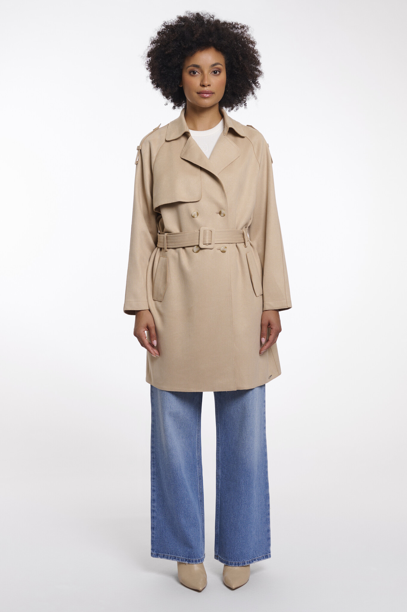- Angled slip pockets with refined flaps, shoulder detailing, and buttoned cuff tabs add classic trench structure. A clean storm flap completes the mid-length silhouette, offering an elevated take on an iconic style.