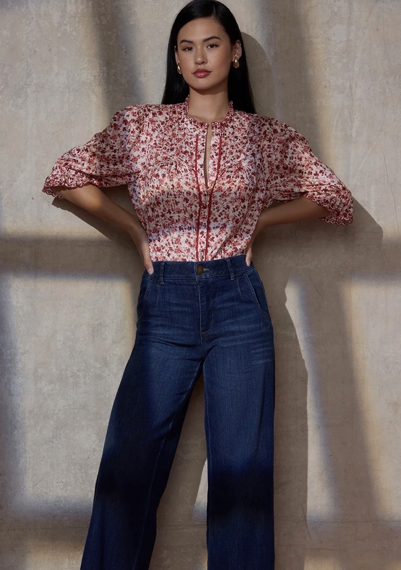 Whitney Wide Leg Crop jeans are designed with a skyrise waist and a feminine tulip hem. They feature an indigo wash, curved front pockets, subtle fading and whiskering details, front and back paneling, and our Contour Shape Technology
